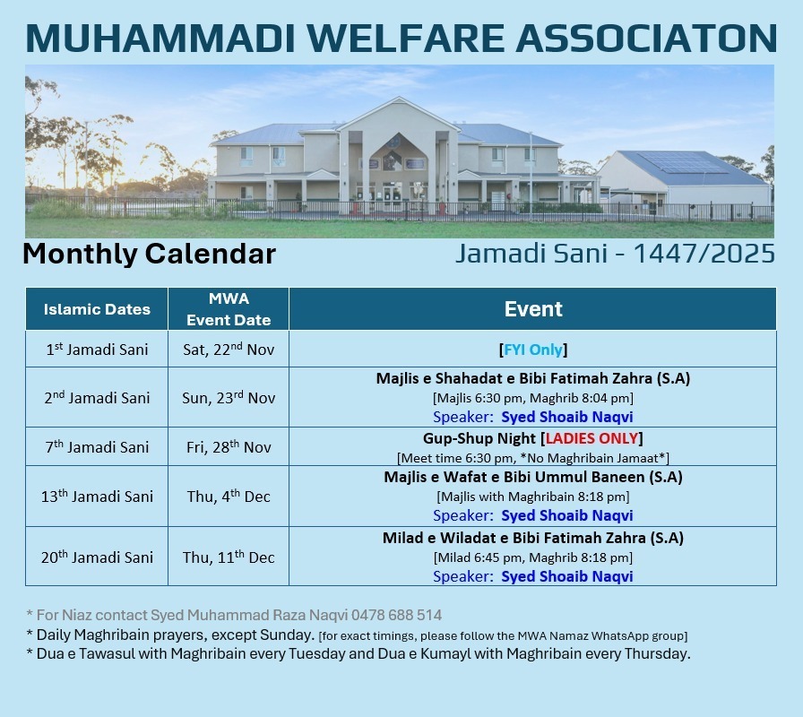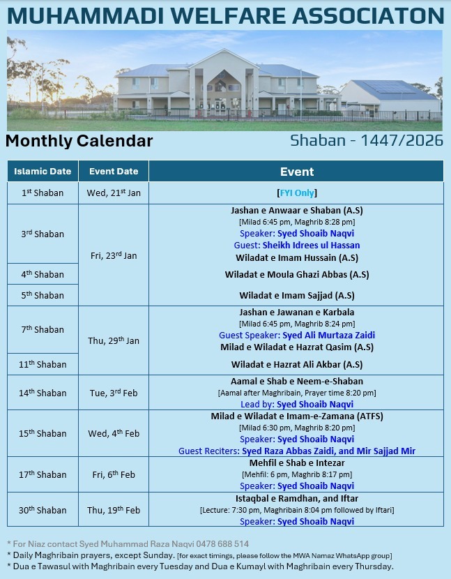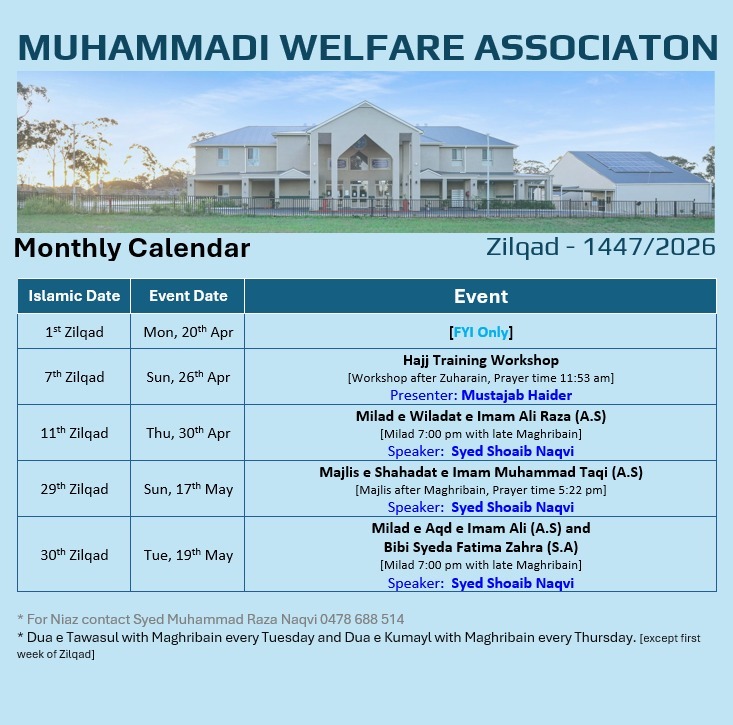MUHAMMADI WELFARE ASSOCIATION INC was founded in 1989 by a group of professionals and university students in Australia. It is an independent initiative whose long term aspirations centre on the preparation for the blessed return of the Saviour, Imam Al-Mahdi (atf).
