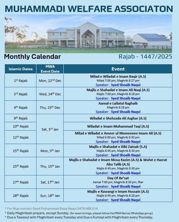 6th Rajab, 1447 - Fri, 26th Dec, 2025 - Sydney, Australia